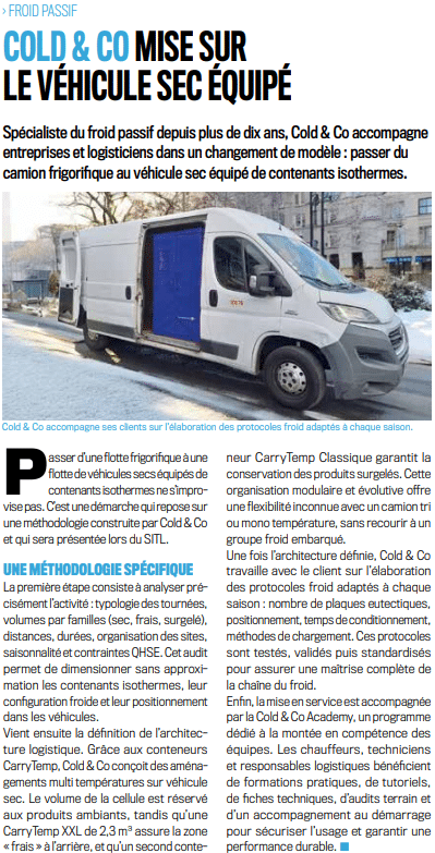 Dans la dernière édition du journal Froid News (numéro 60, avril 2026), un article détail la manière dont COLD & CO accompagne ses clients pour leur logistique du froid et son optimisation grâce au froid passif. Aujourd’hui, une transformation majeure s’opère : le passage du camion frigorifique traditionnel vers des véhicules secs équipés de contenants isothermes performants. Une évolution qui répond à des enjeux concrets : réduction des coûts, flexibilité opérationnelle et transition énergétique. Focus.
